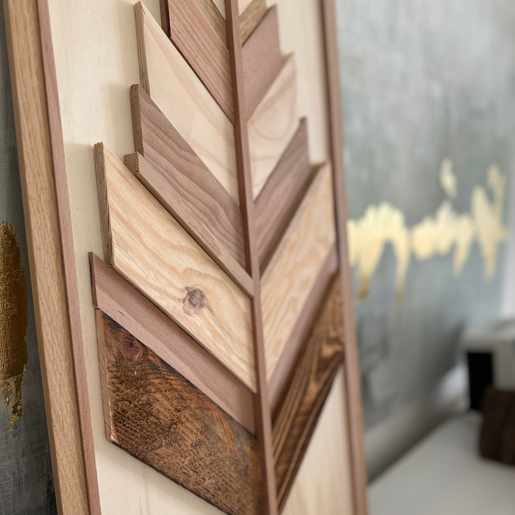 Holzbild Feder bunt, verschiedene Holzsorten kombiniert