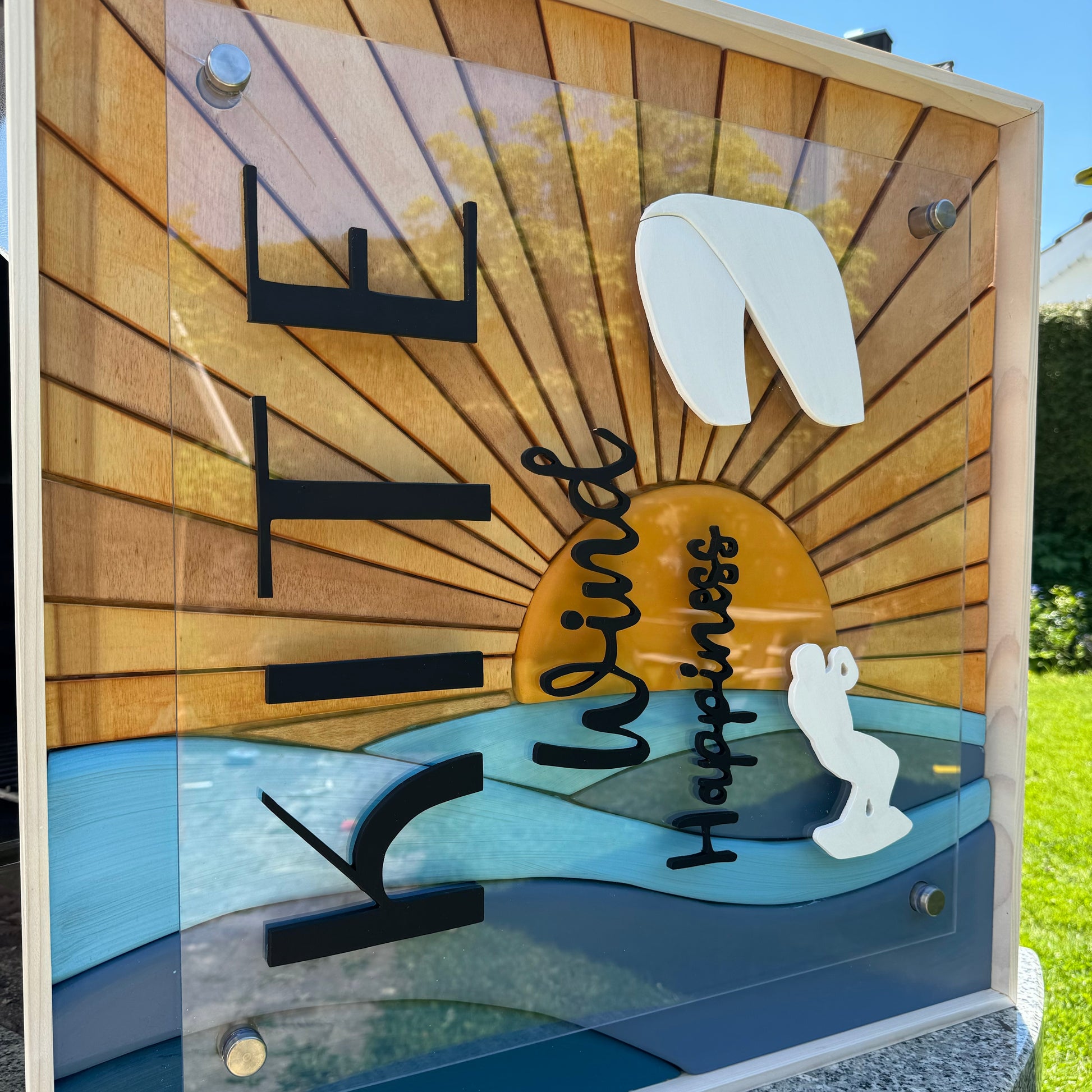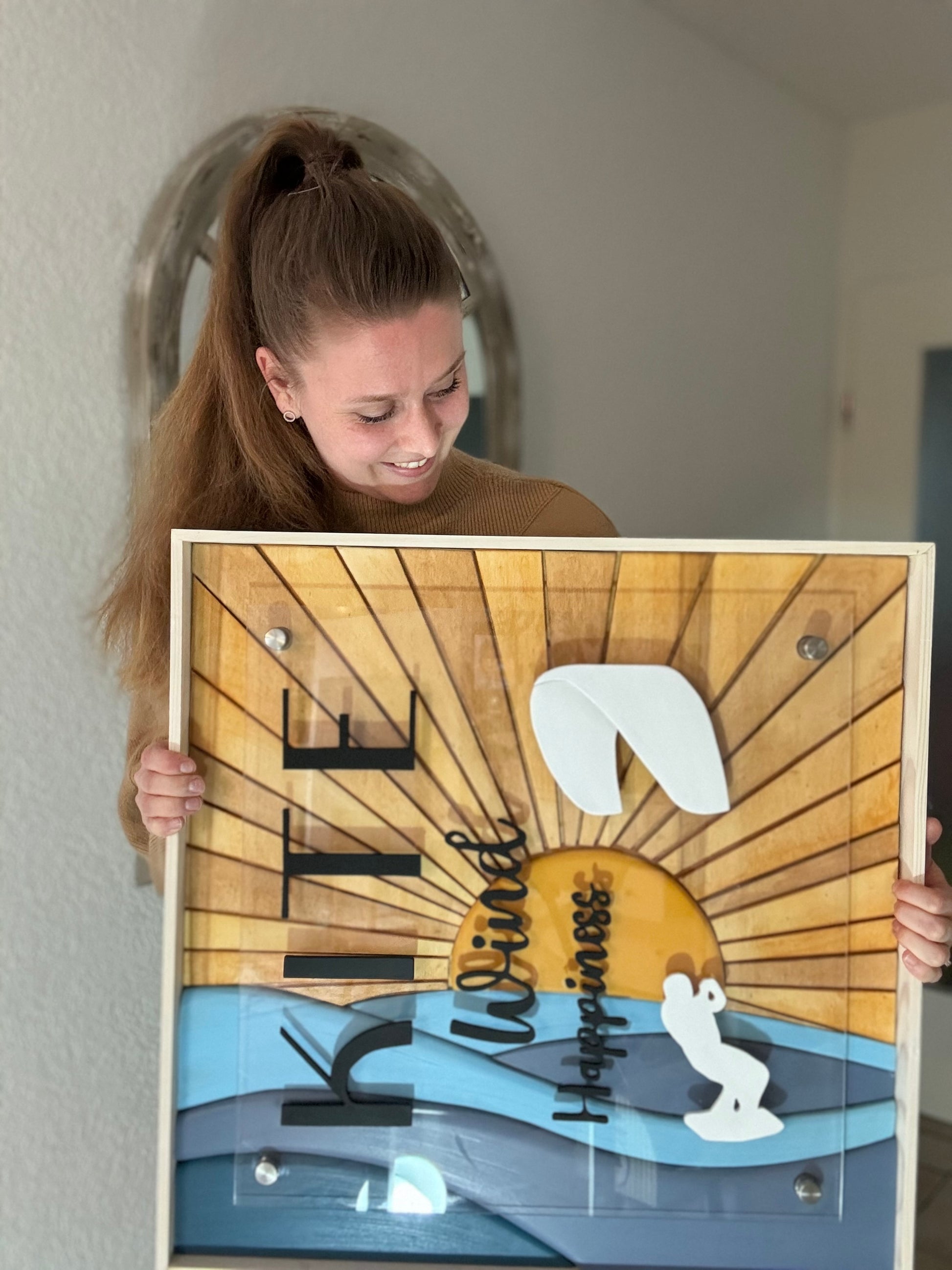 Das Motiv zeigt einen herrlichen Sonnenuntergang in schönen Holztönen. Die Sonne verschwindet im welligen Meer, was durch seinen speziellen 3D-Effekt besticht. Darüber ziert ein Kitesurfer inklusive Schriftzug, der alle begeisterten Kitesurfer anspricht.
