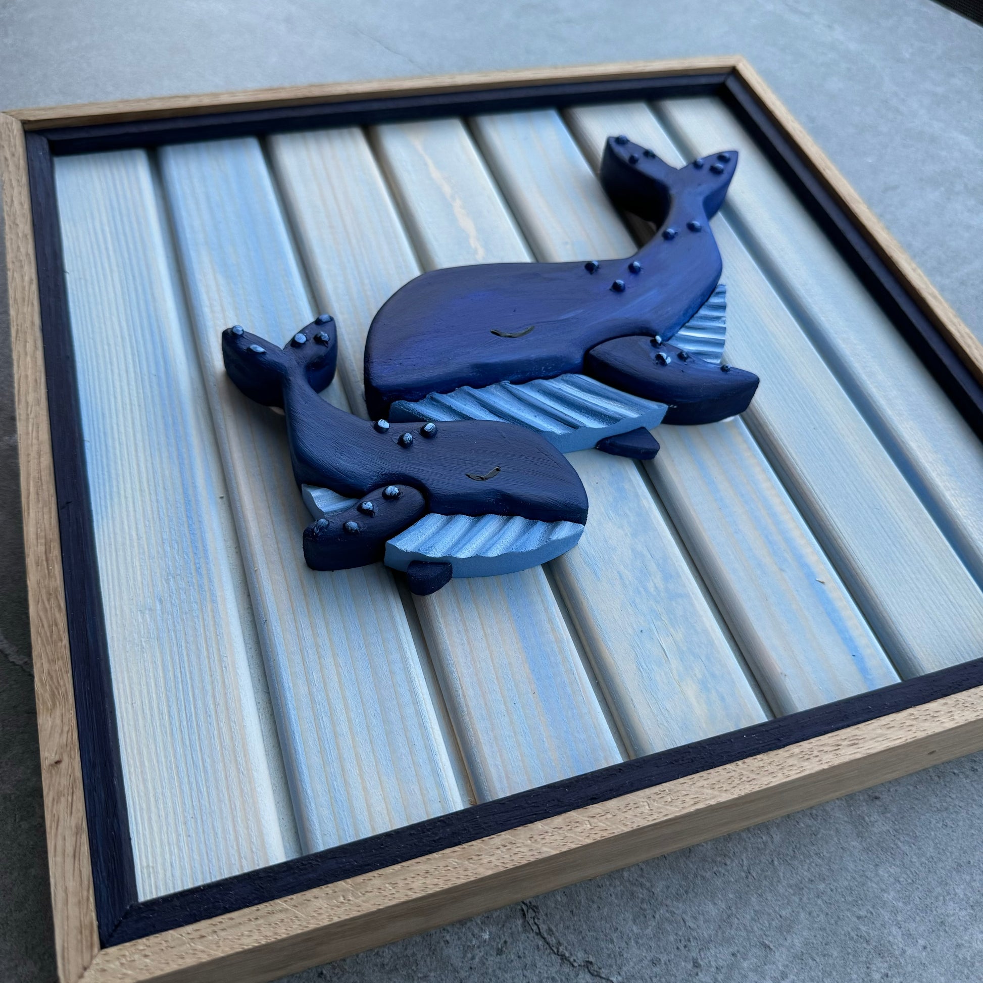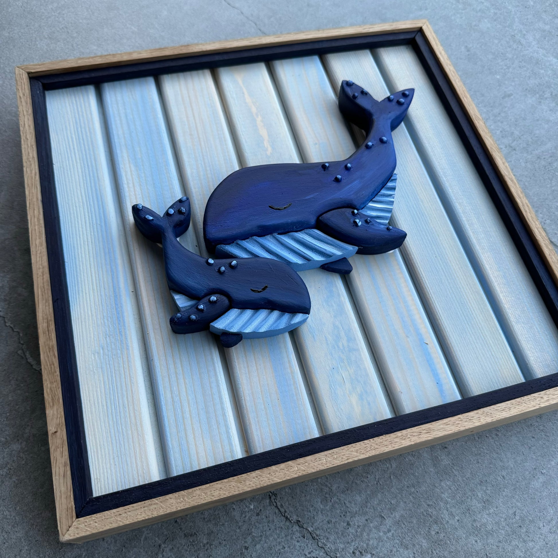 Holzbild mit Doppelrahmen aus Eichenholz, süsse Wale, 31x31cm