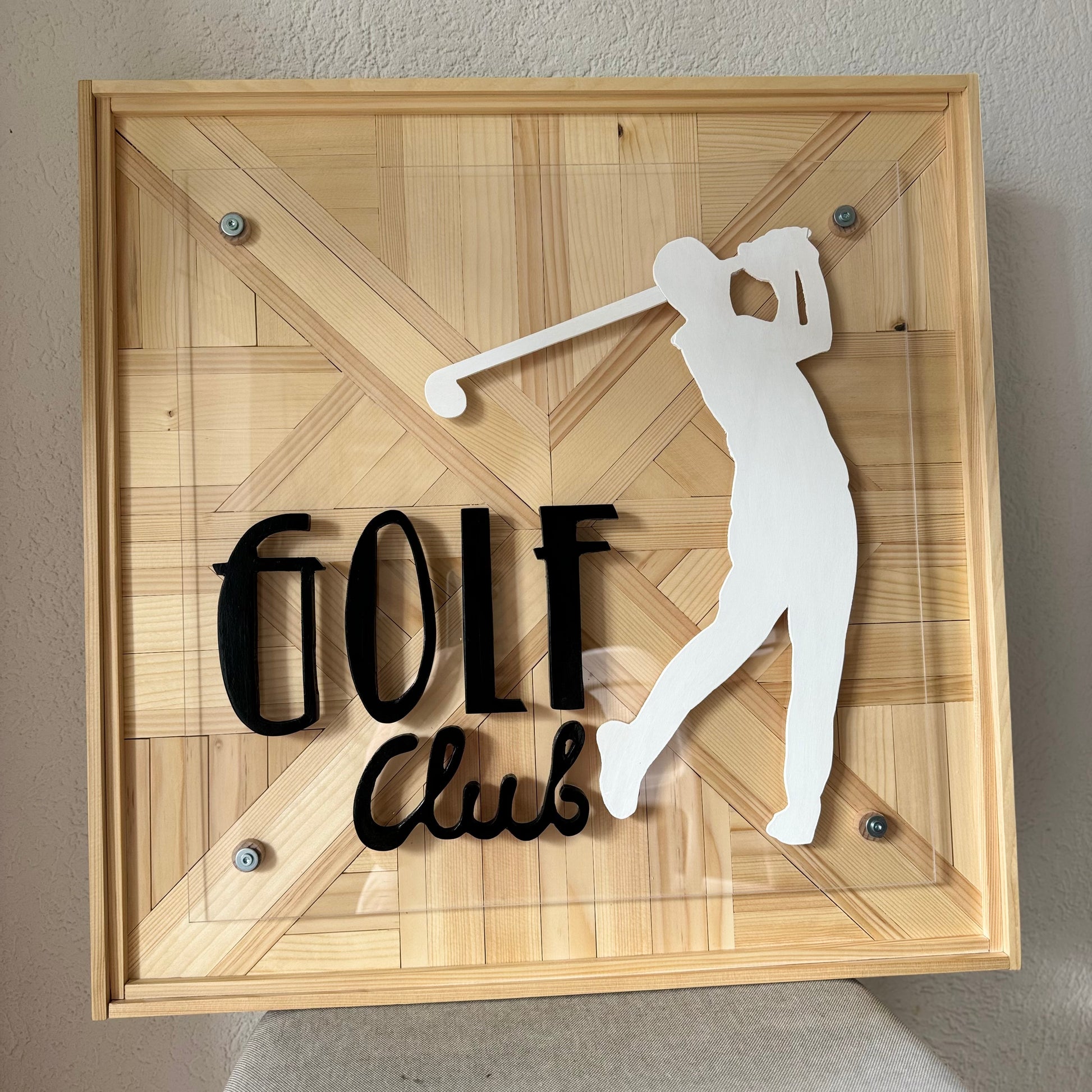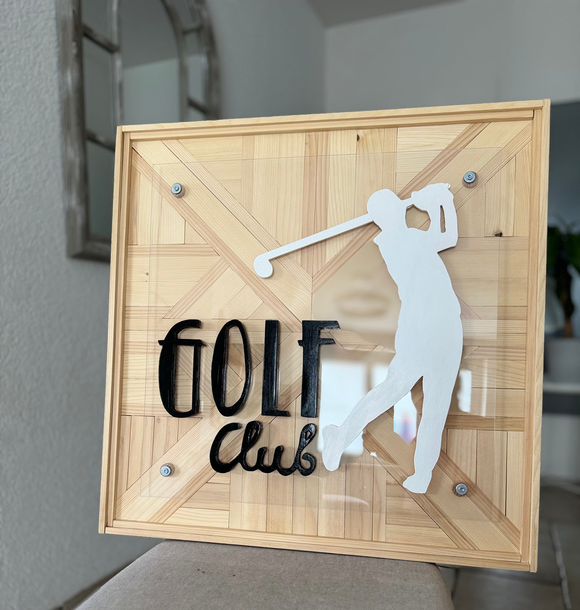 Holzmosaik aus Fichtenleisten mit Doppelrahmen, geölt mit Naturöl, um die natürliche Holzstruktur noch besser zur Geltung zu bringen. Dazu eine Acrylglasplatte in der Grösse 50x50cm mit einem Abbild eines Golfers und dem Schriftzug "Golf Club".