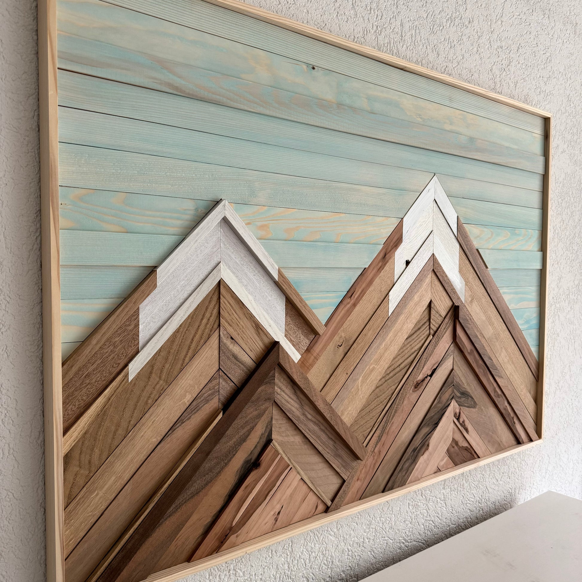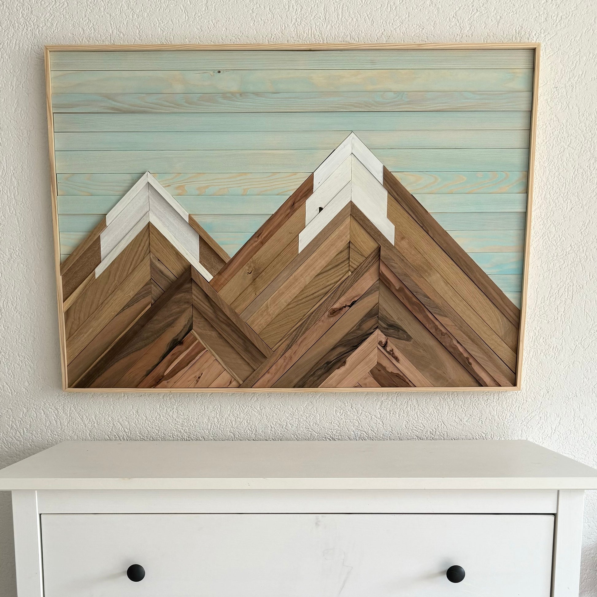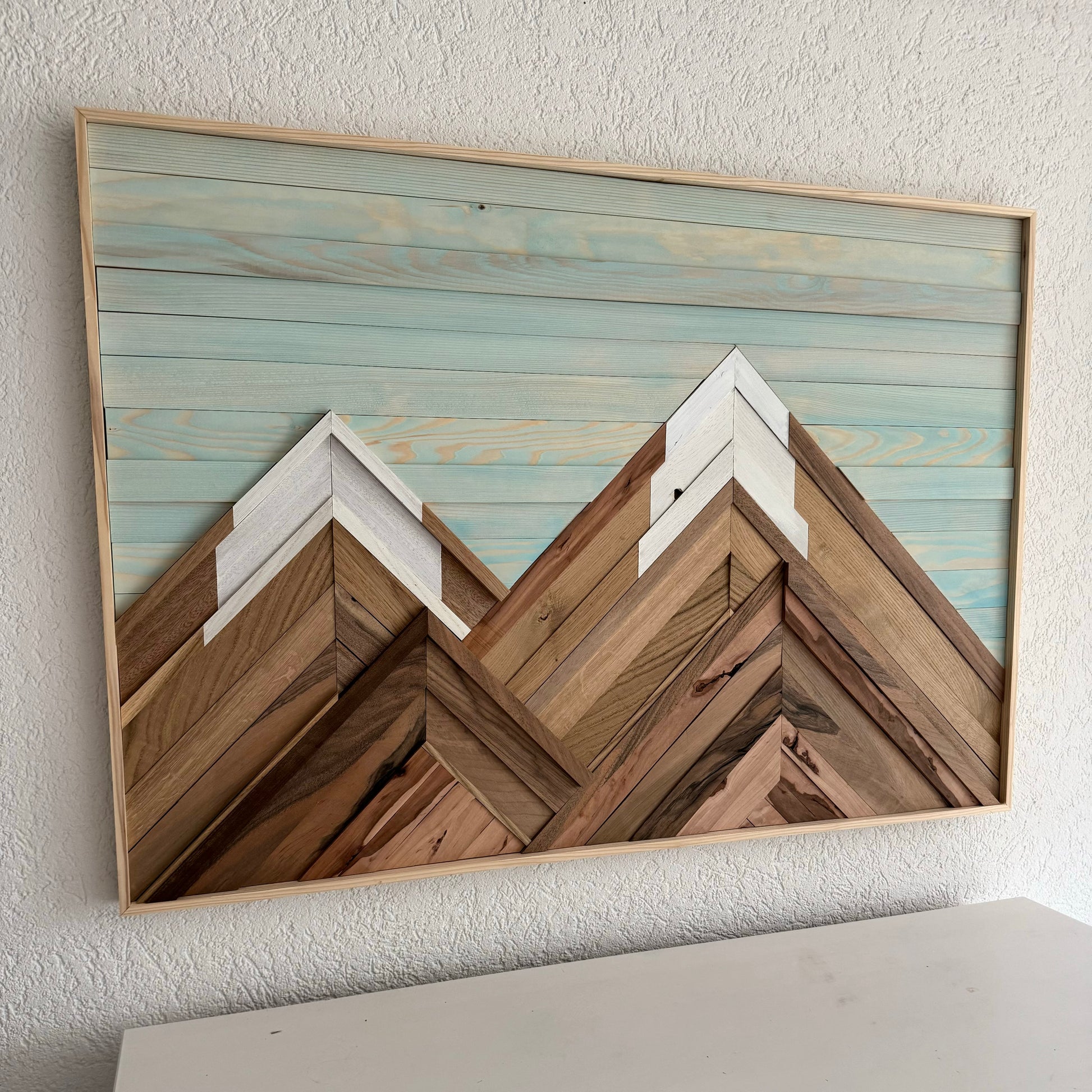 Dieses schlichte und elegante Design einer Berglandschaft vereint alles, was die Natur an Schönheit ausmacht. Die Natürlichkeit des Holzes, die schlichten Farben, die Struktur der Berge. Ein Holzmosaik, was perfekt als Wanddekoration in jeden Wohnraum passt.