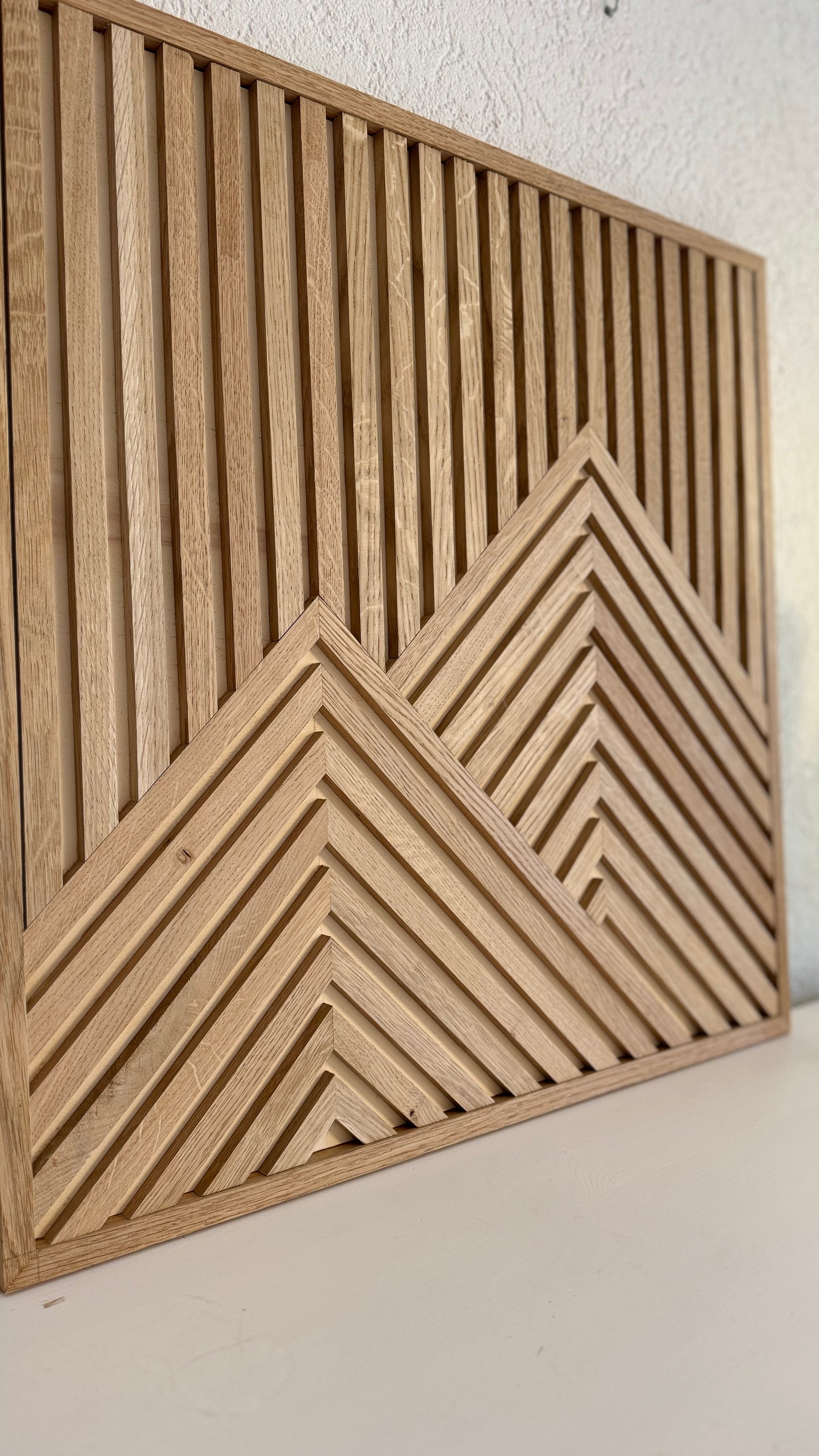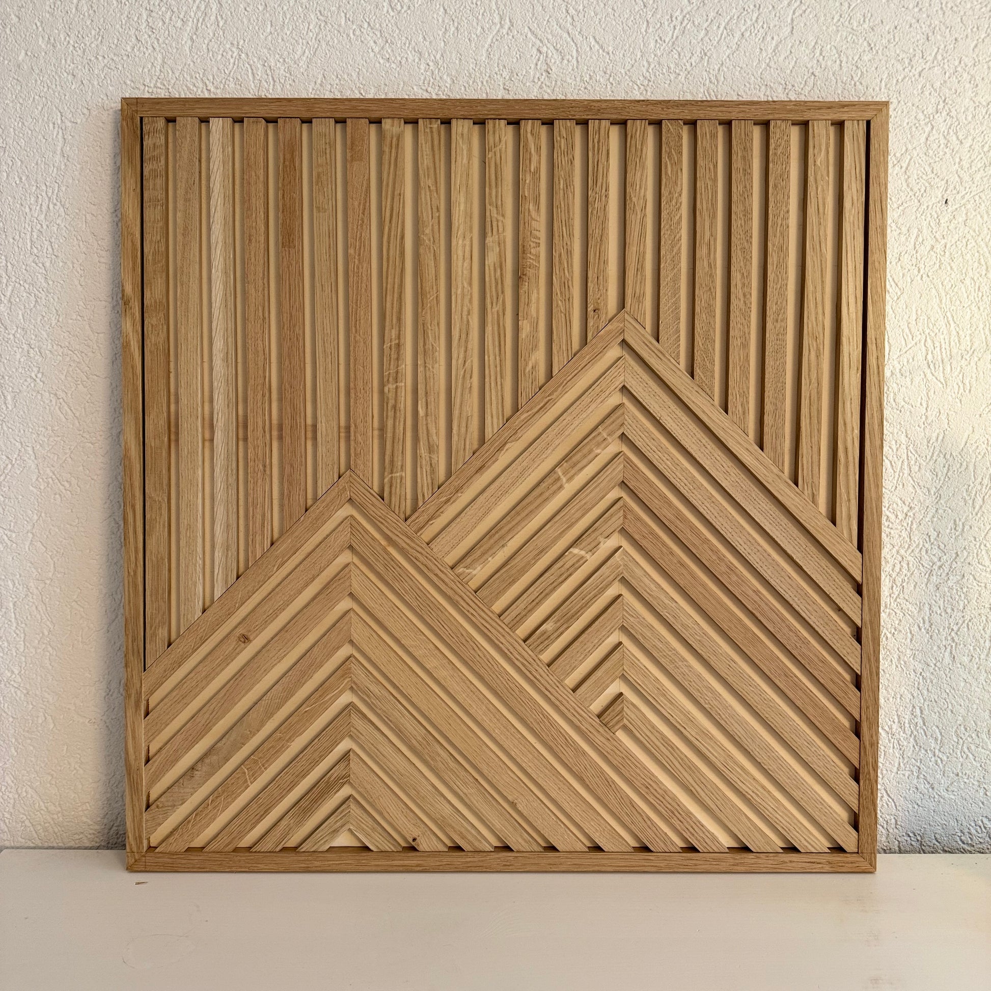 Die Eichenleisten sind unbehandelt und symmetrisch auf einer Spanplatte montiert. Durch den eleganten Bilderrahmen, der sich komplett in das Bild integriert, erhält das Holzkunstwerk einen sehr schlichten und eleganten Look.