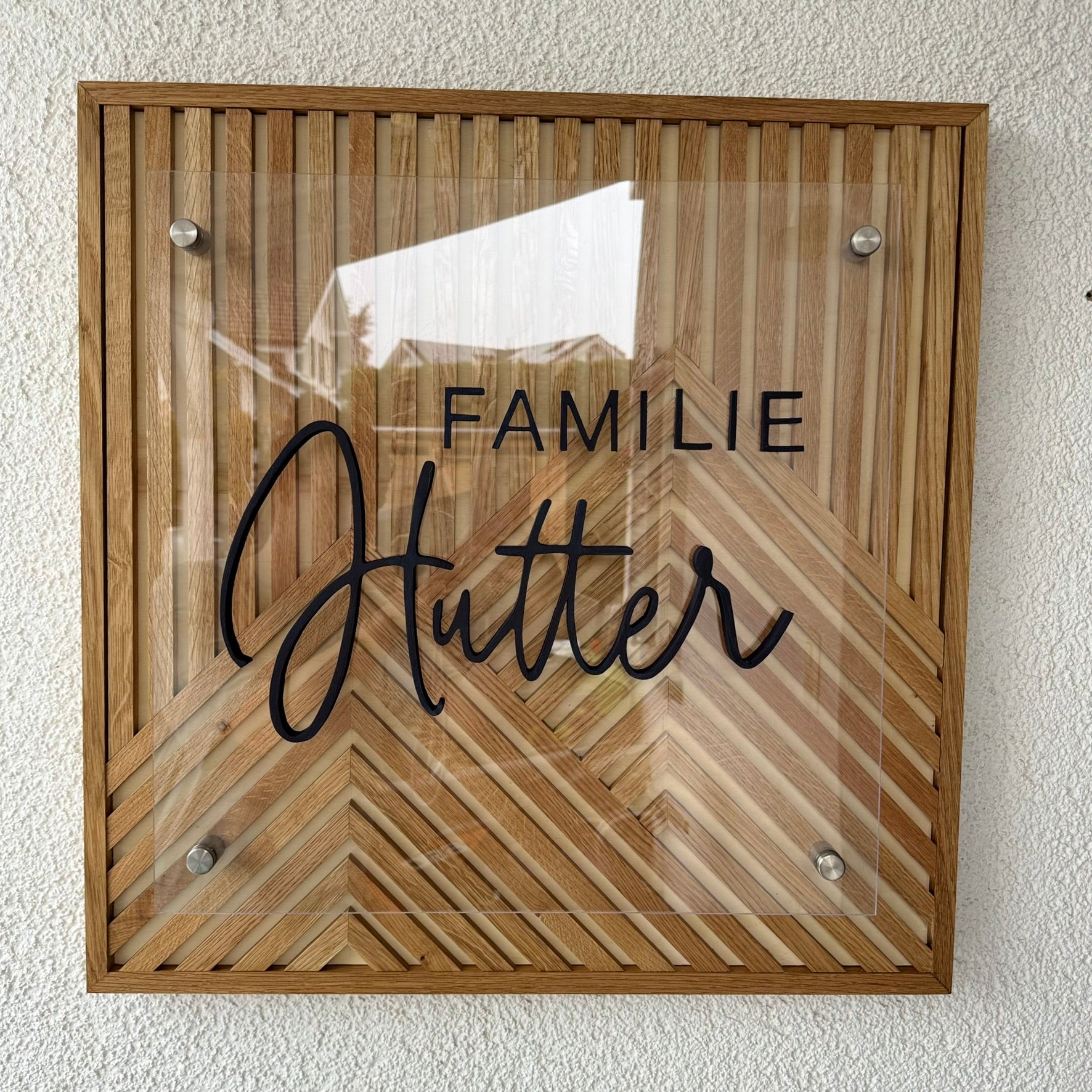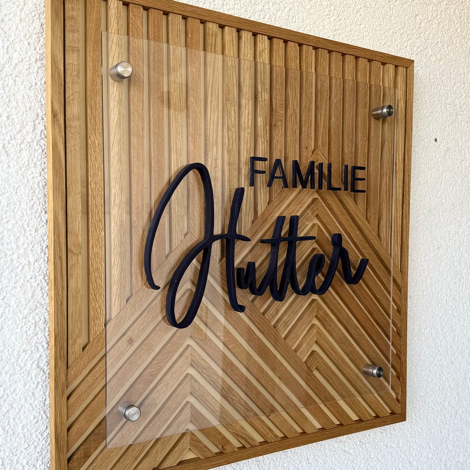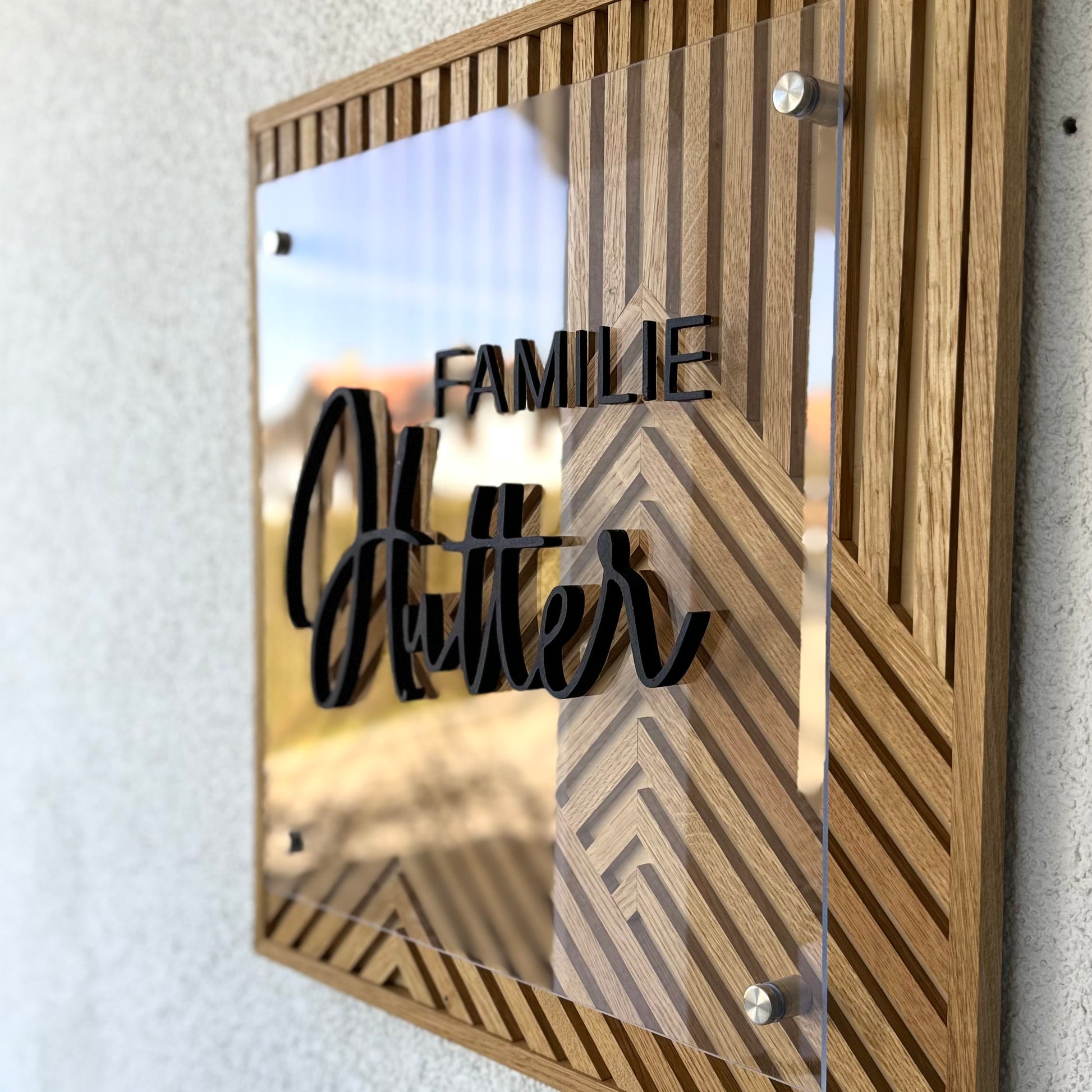 Als Highlight wird eine Acrylglasplatte von 50 x 50cm mit vier Metallständern auf dem Bild montiert, worauf euer persönlicher Familienname drauf stehen kann. Einfach das perfekte Statement Piece für jeden Eingangsbereich - egal ob im Innen- oder Aussenbereich.