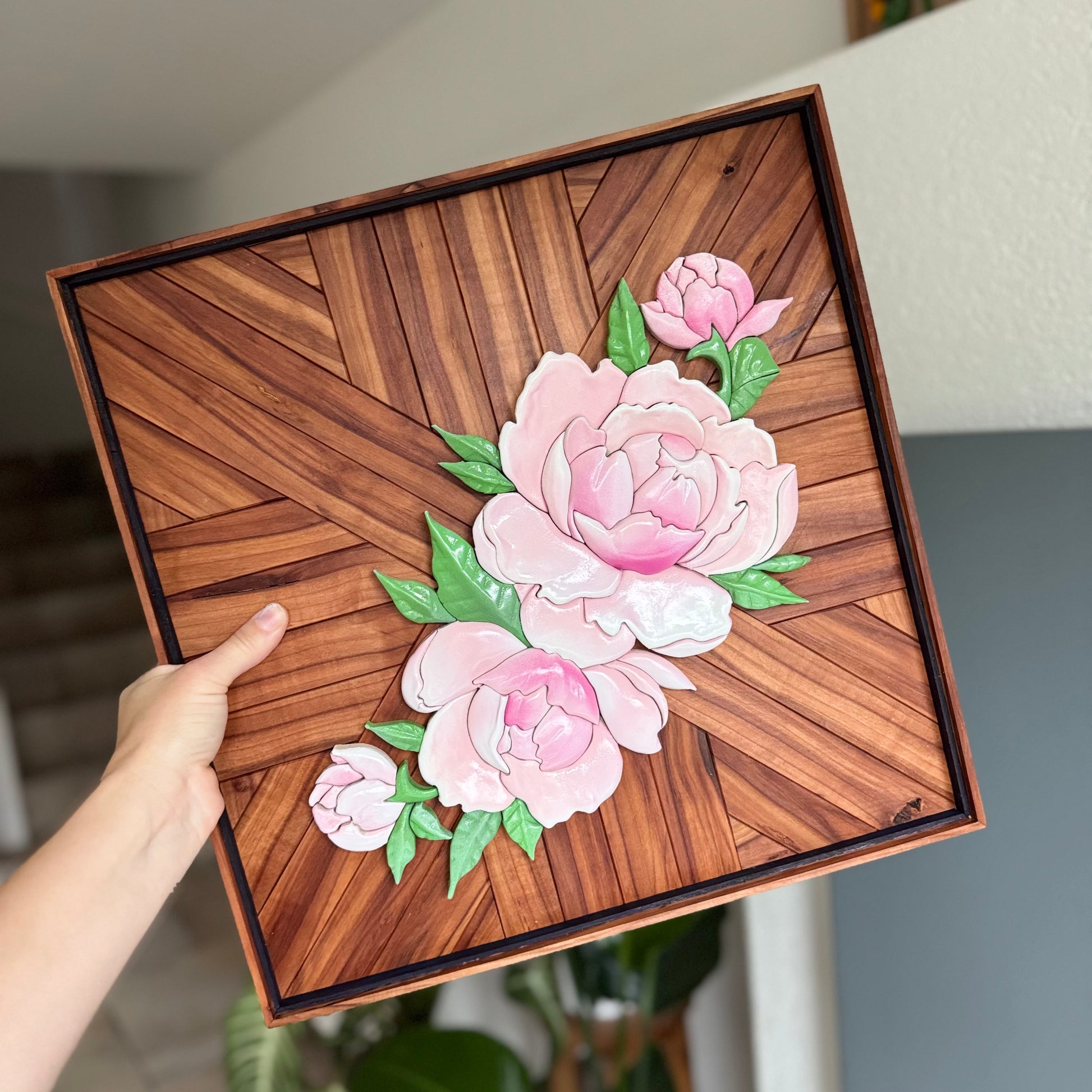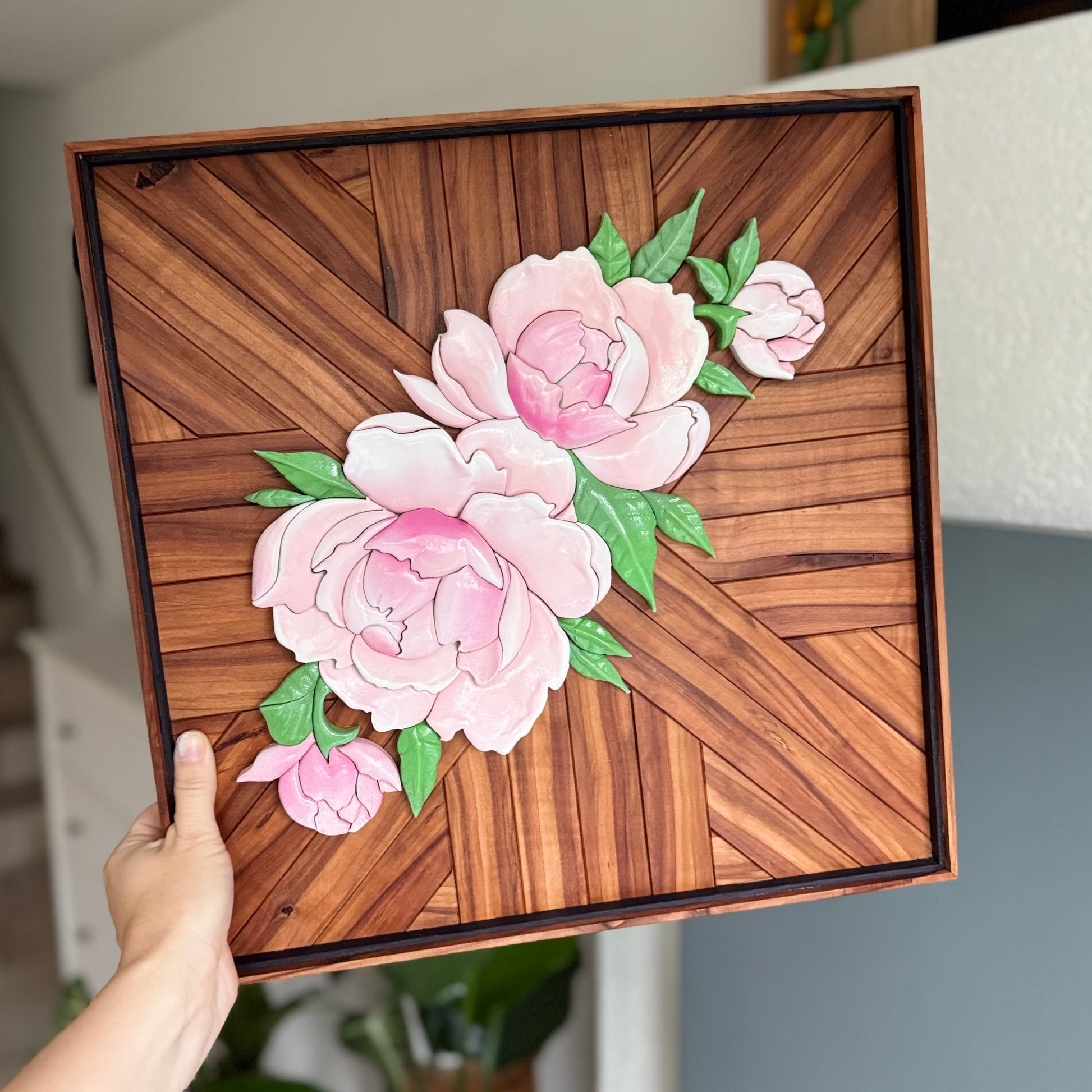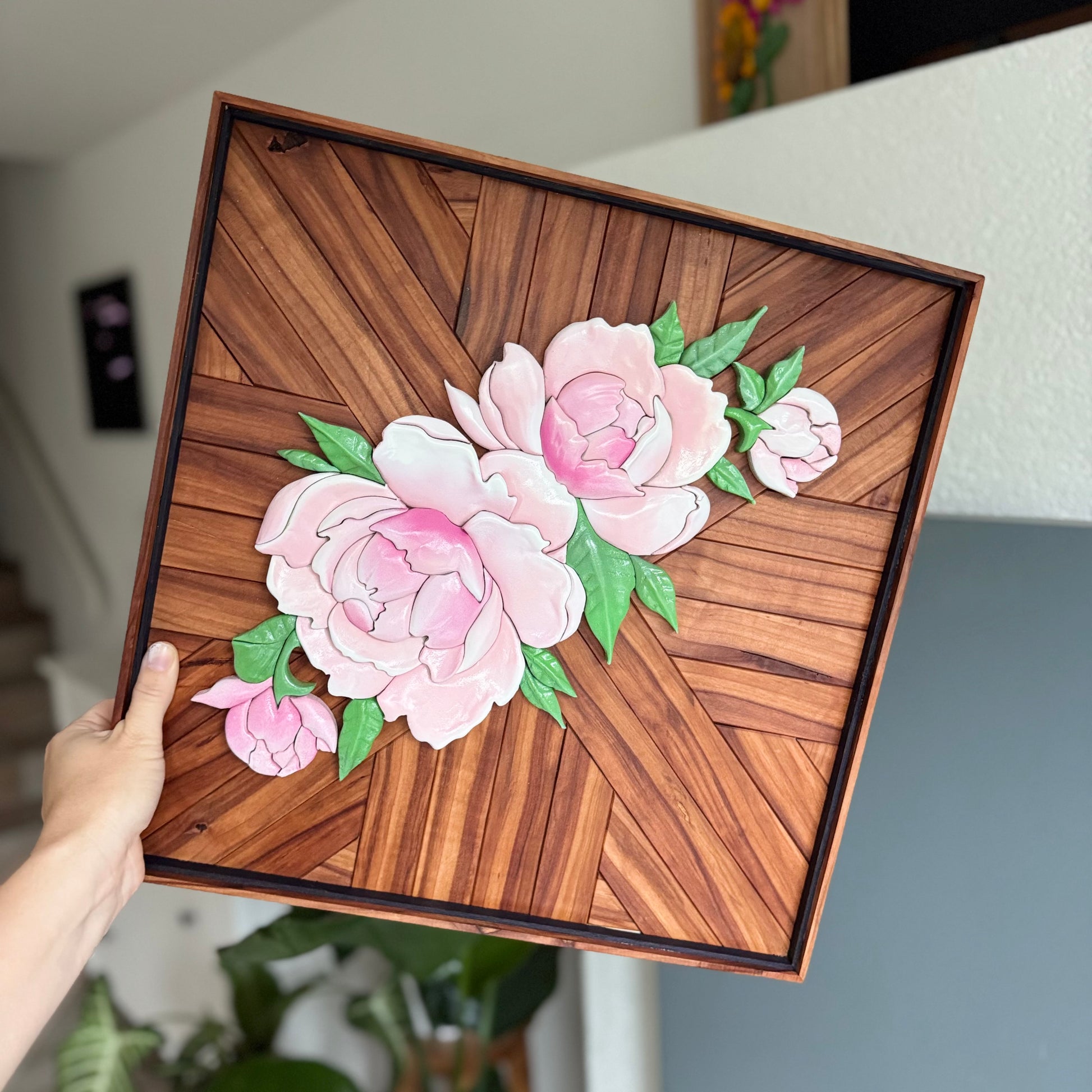 Pfingstrosen auf Mini-Mosaik aus Apfelholz, doppelt gerahmt, ca. 41x41cm
