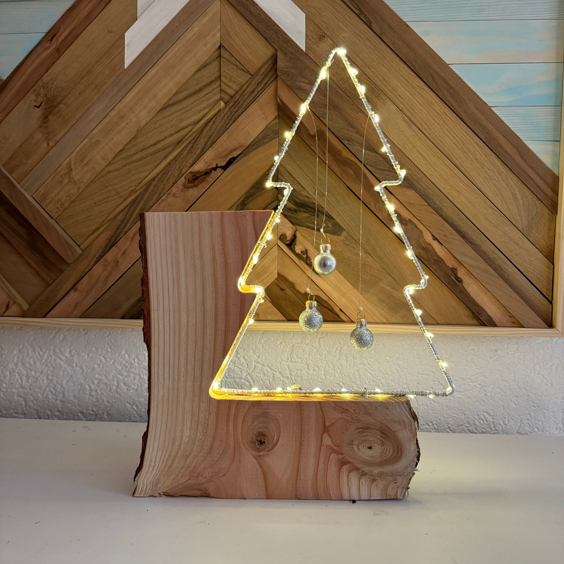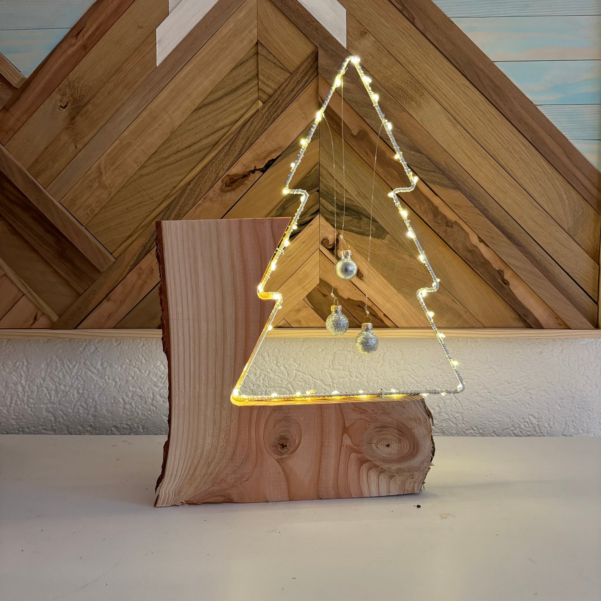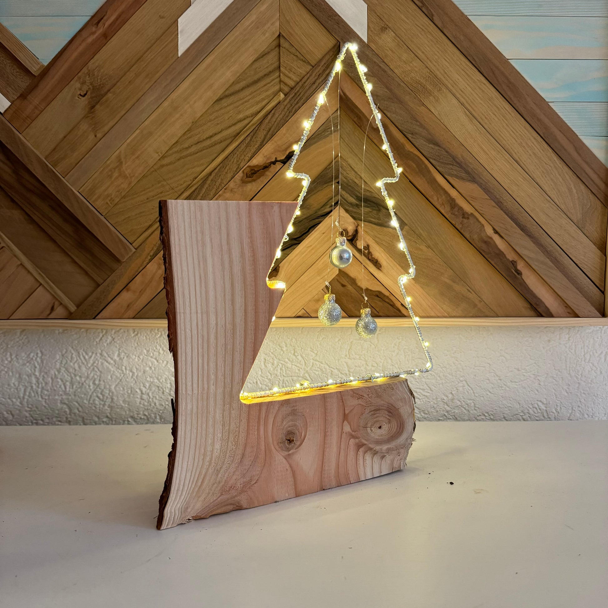 Dieser leuchtende Weihnachtsbaum aus weissem Metall ist eingefasst in ein wunderschönes Stück Douglasienholz und macht es zu einer sehr eleganten Weihnachtsdekoration. Schlicht und natürlich schön.