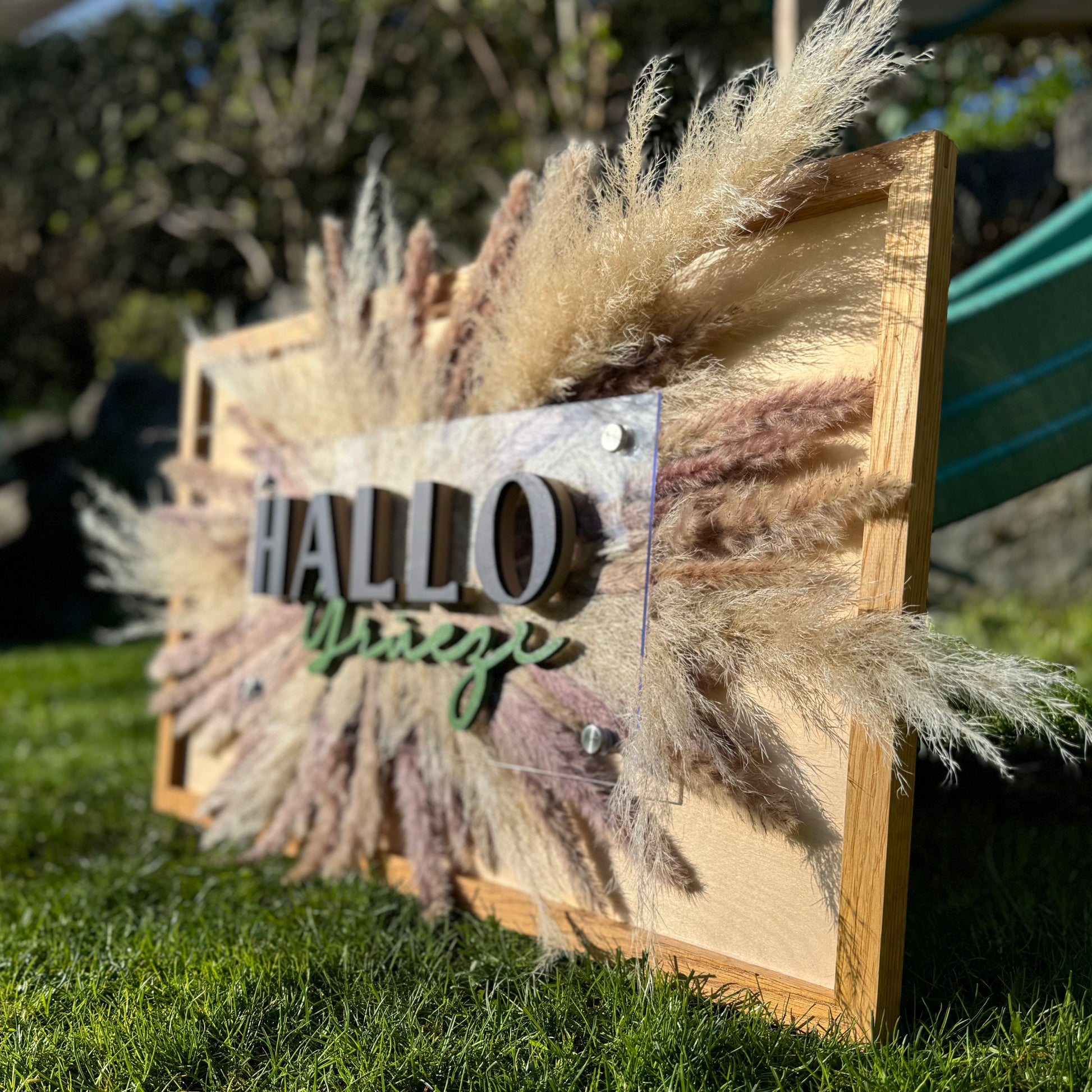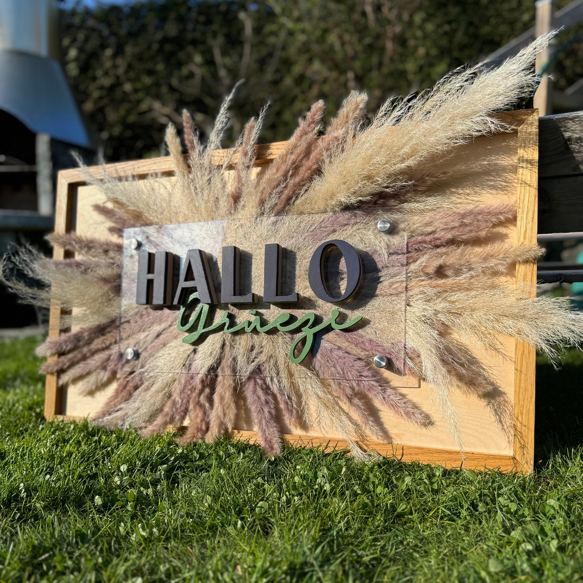 Gerahmt in massivem Eichenholz und verziert mit einem traumhaften Trockenblumenbouquet, bringt dieses Schild eine warme, natürliche Atmosphäre an deinen Hauseingang oder in deinen Wohnbereich.